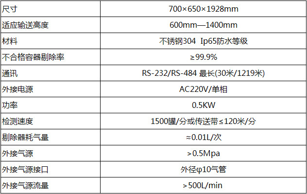 我公司以上三款檢測機和剔除器可實現(xiàn)高度、寬度調(diào)節(jié),并自帶高度數(shù)字顯示器,操作簡便。內(nèi)部程序最多可存儲10種產(chǎn)品數(shù)據(jù),能實現(xiàn)一條生產(chǎn)線上不同罐型、瓶型的檢測及剔除。